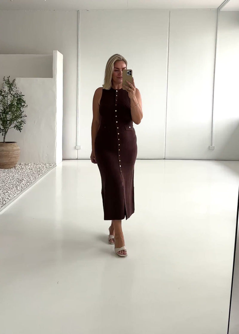 Shop the Tully Knit Midi Dress in Chocolate now and experience comfort and style in one!