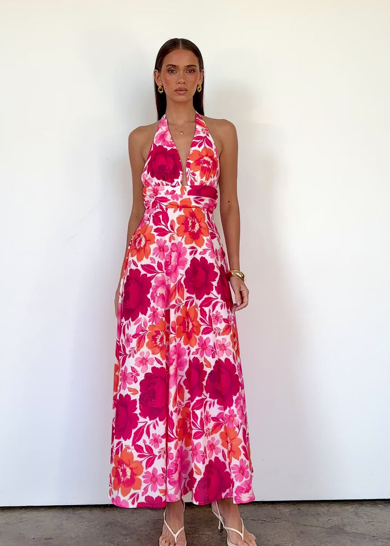 Step into feminine charm with the Valkyrie Halter Maxi Dress in pink bloom, designed with soft florals and a shoulder-framing neckline. Perfect for weddings, garden parties and special moments.