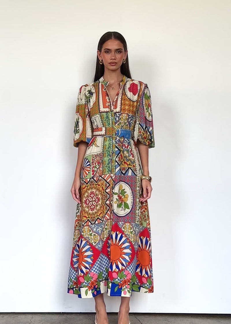 Bright, breezy, and ready for warm days, the Vivia Midi Dress – Amalfi Mosaic is ideal for brunches, seaside lunches, or sunny celebrations. Pair with sandals and a woven tote for easy chic.