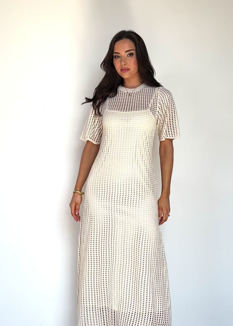 The Vivvy Crochet Maxi Dress - Cream blends timeless elegance with a bohemian vibe. Pair it with a low braided bun, pearl drop earrings, and tan strappy sandals for a relaxed yet classy look. A woven clutch will complete the ensemble beautifully.