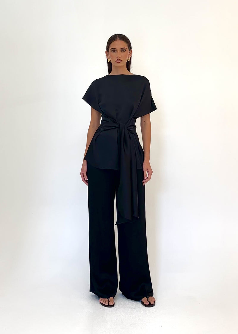 Classic black meets a flattering tie detail for easy styling. Pair with tailored trousers or skirts for a polished look. Wiluna Tie Top works day to night seamlessly.