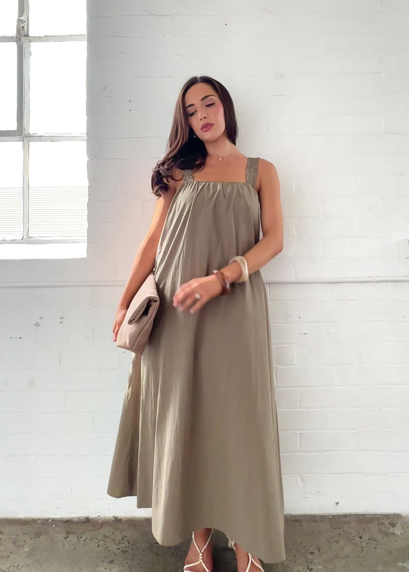 Add the Woodstock Maxi Dress – Khaki to your wardrobe today.