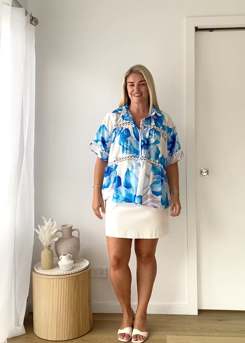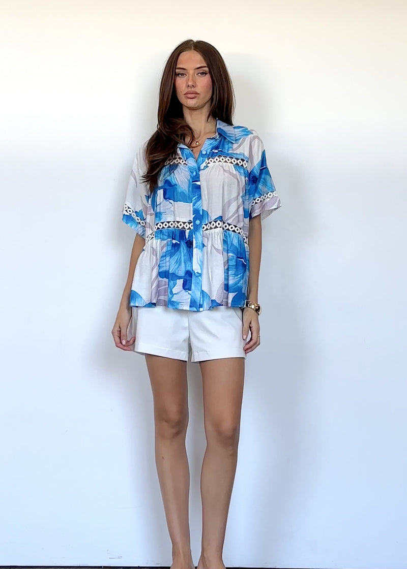 Freshen up your wardrobe with the Zahra Shirt - Blue Flowers. Perfect for pairing with skirts, shorts, or trousers for brunch, office looks, or casual day outings.