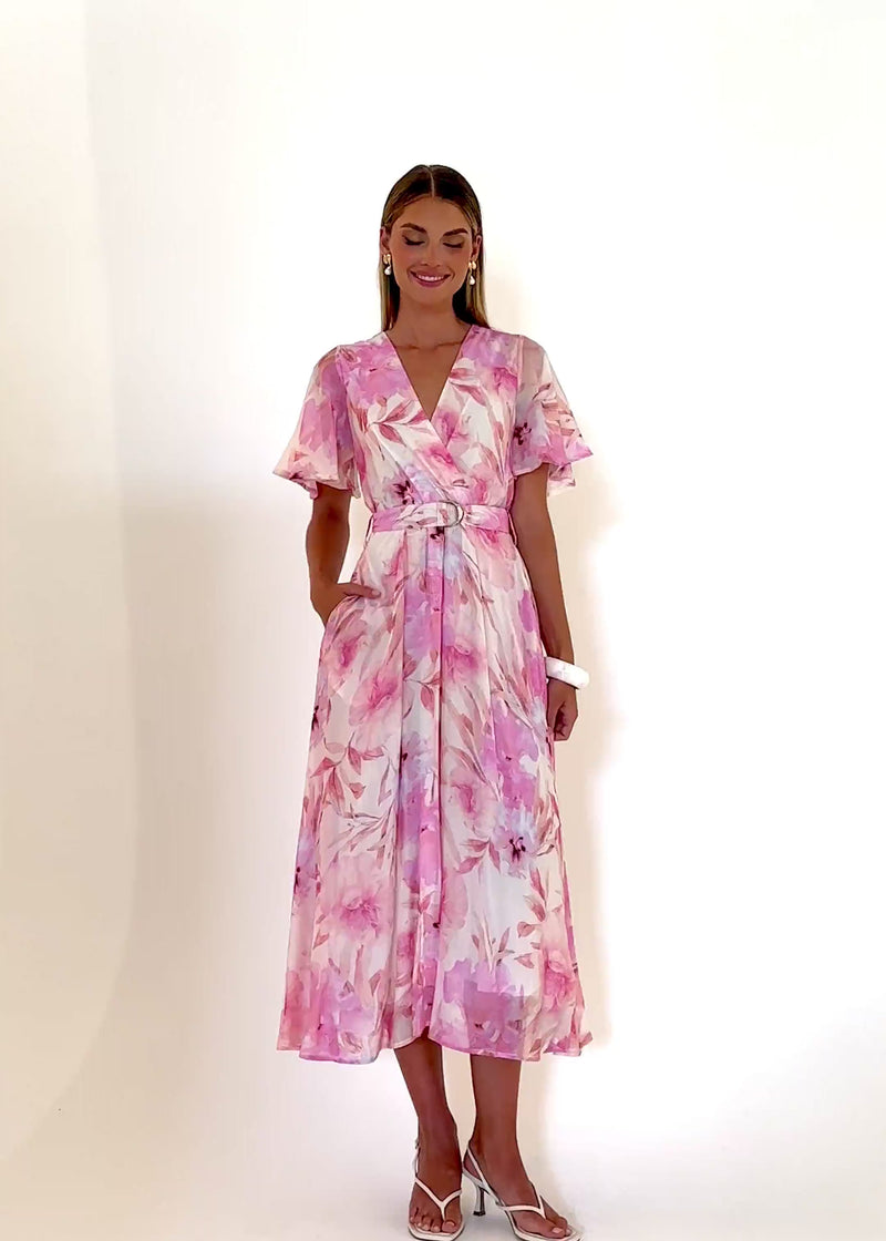 Soft and playful, the Zanzibar Midi Dress in Pink Floral is perfect for brunches or garden parties. Pair with wedge heels and a woven bag for daywear, or dress it up with a clutch and block heels for evenings. Add the matching accessories for a coordinated look.