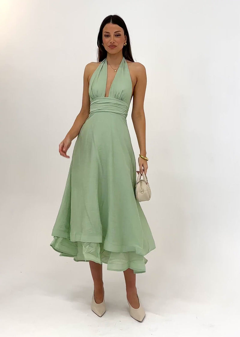 Fresh and modern, the Zayde Halter Midi Dress - Mint Green is ideal for garden parties, beach weddings or chic dinners. Pair with metallic sandals and layered jewellery for an effortlessly elevated vibe.
