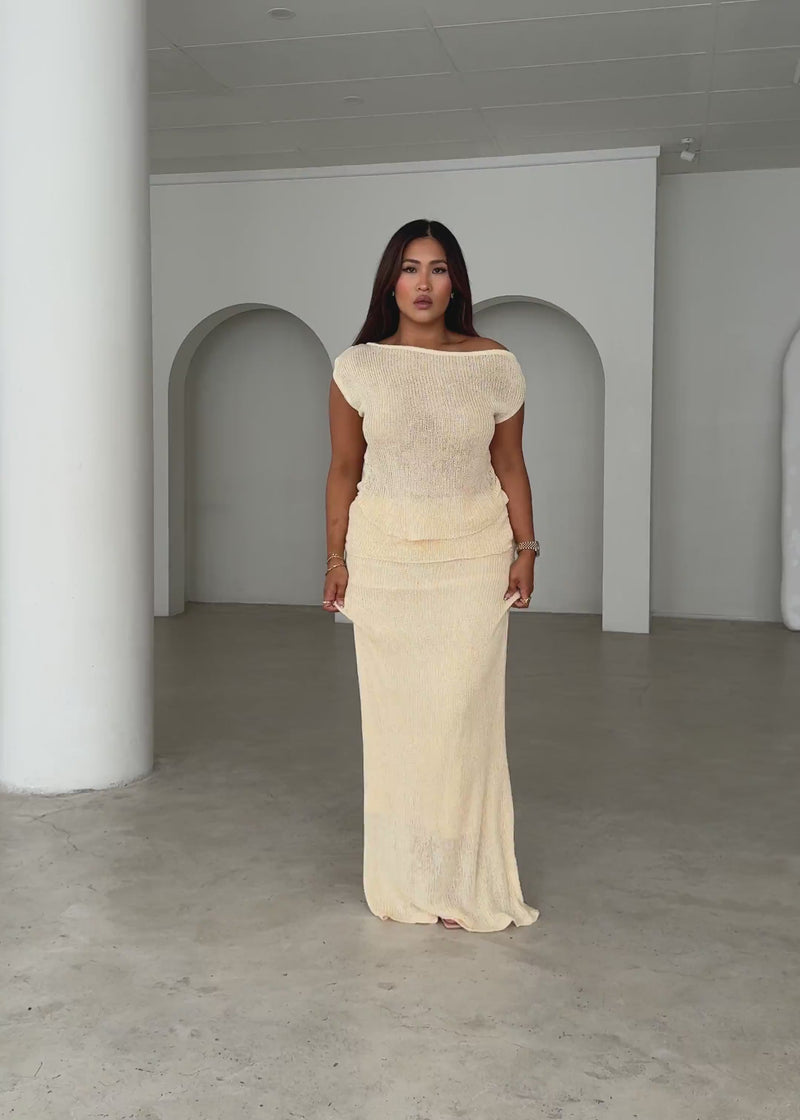 Make everyday style easy with the Zion Drop Shoulder Knit Top in Butter. It’s the perfect match for your favourite jeans or the Zion skirt. Throw on a crossbody, white sneakers, and gold huggies to complete the look.
